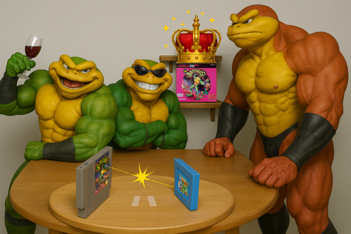 GB版、と言うと分かりにくいんだけど、 ゲームボーイのバトルトードは2作あって、 1つはNES版と同年の91年にリリースされ 94年には日本でも発売されたバージョン。 NES版とは全く異なる9面構成で、 比較的親しみやすい難易度と共に、 GB屈指の良ゲーとして知られている。 ゲームボーイが好きな人に語らせたら 話が止まらないだろう。 そして、今1つが、この「Ragnarok's World」 という副題の付いたバージョンで、 これはNES版の移植となっている。 93年に欧米で発売。 副題付いてない91年発売版がGBオリジナルで 副題付いてる93年版がNES型だとは。 で、日本国内で94年に出たのは91年版。 ・・・だから分かりにくいんだよっ!(笑) EXPERTモードがあるって嘘まで流されてさ。 早速、NES版との難易度対決、いってみましょ! |